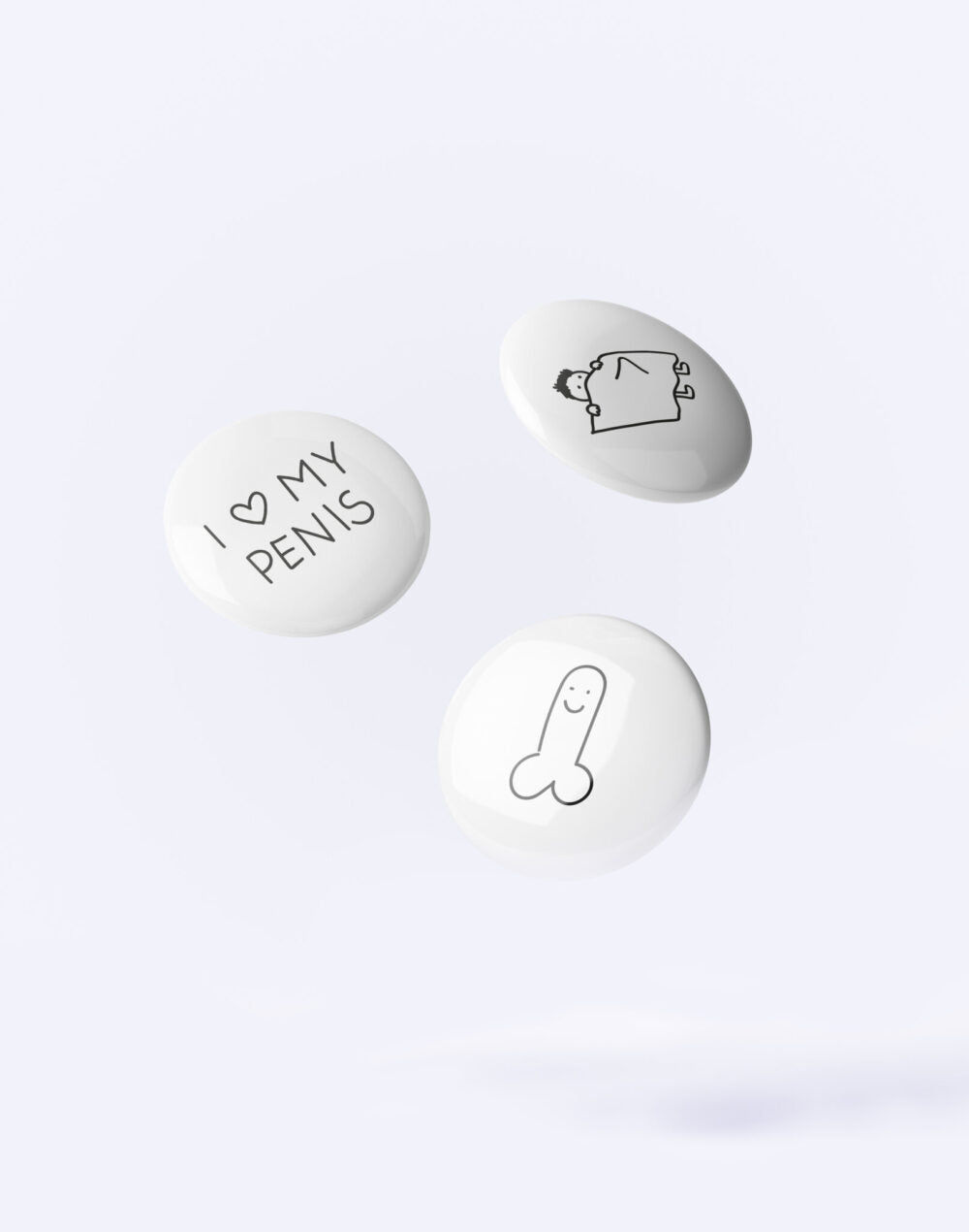 Embrace your love for all things cheeky with the Butt-Ons - I Love My Penis pin set by Dicks Don’t Lie. Featuring a playful trio of buttons, including a smiling penis, a guy pitching a tent under the sheets, and the bold declaration "I ♡ MY PENIS," these pins are sure to add some fun to your outfit and turn heads wherever you go.